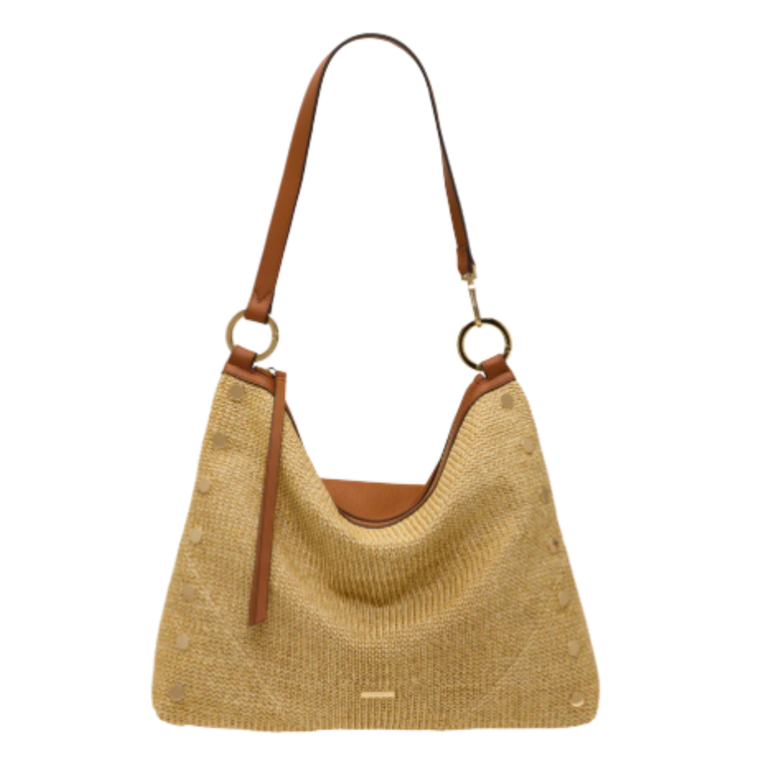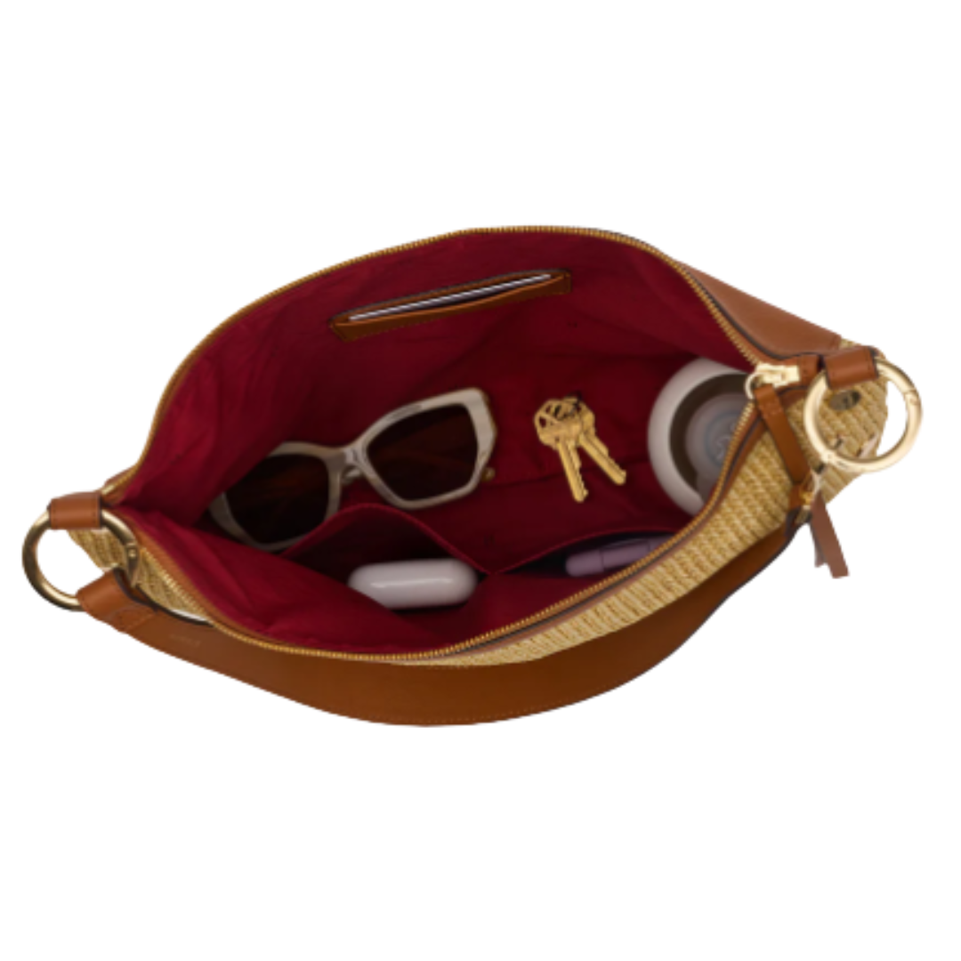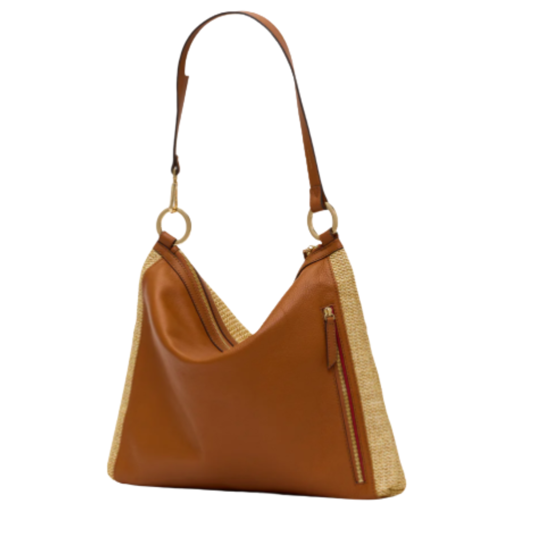 -Crafted with a combination of chaparral raffia, medium tone tan brown pebbled leather and mosaic brown pebbled leather