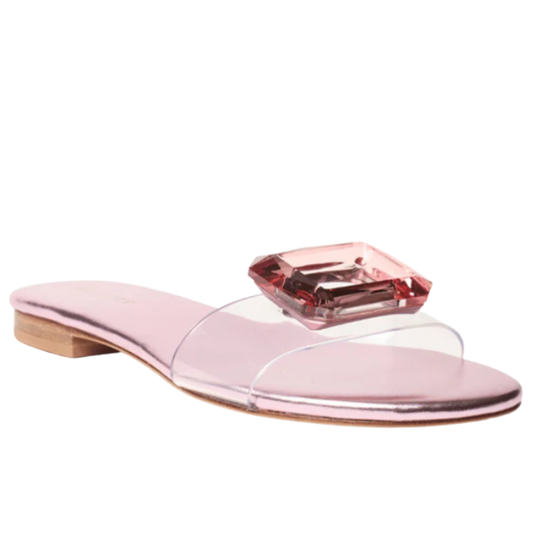 Introducing Phillis by Cecelia New York—a refined flat that seamlessly transitions from day to evening. The striking rose jewel adorning the vamp adds a touch of sparkle, while the minimalist design and delicate ankle strap deliver understated sophistication.