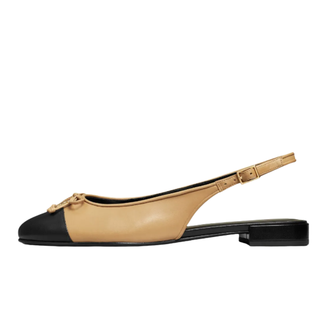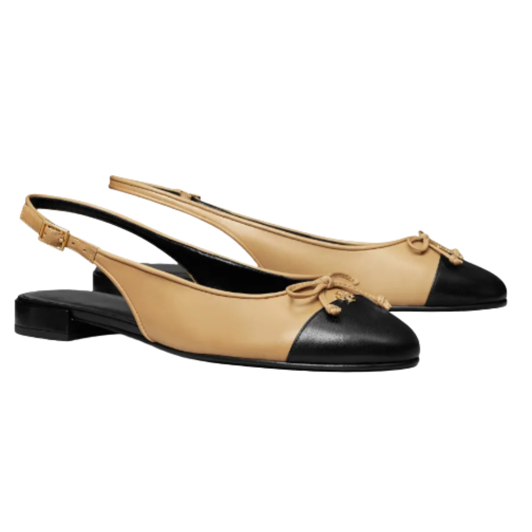 The enduring sophistication of a contrasting cap-toe complements a buckled ankle strap. Resting on a low block heel with a discreet flare, the refined slingback ballet shoe showcases a smaller version of the signature Double T. Crafted from premium smooth and patent leather.